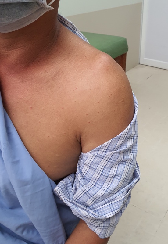 - เจ็บบริเวณไหล่ด้านนอกหรือด้านหน้า
